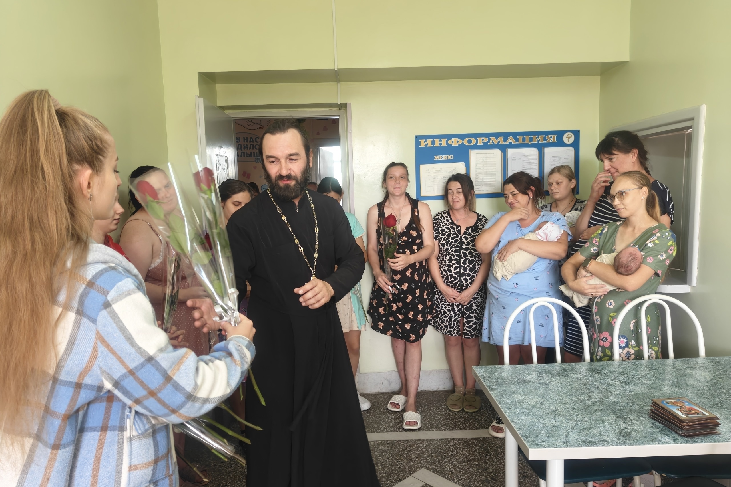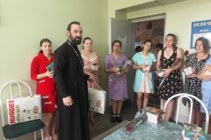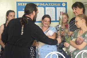 После слов назидания, отец Роман передал подарки от Николая епископа Георгиевского и Прасковейского: одноразовые подгузники для новорожденных, сладкие угощения, благословил каждую женщину и подарил иконы Божией Матери, в так же православные молитвословы о детях, буклеты о Таинстве крещения и алые розы. Прощаясь, священник пожелал мамочкам с детками скорейшей выписки, а беременным благополучных родов и здоровеньких деток.