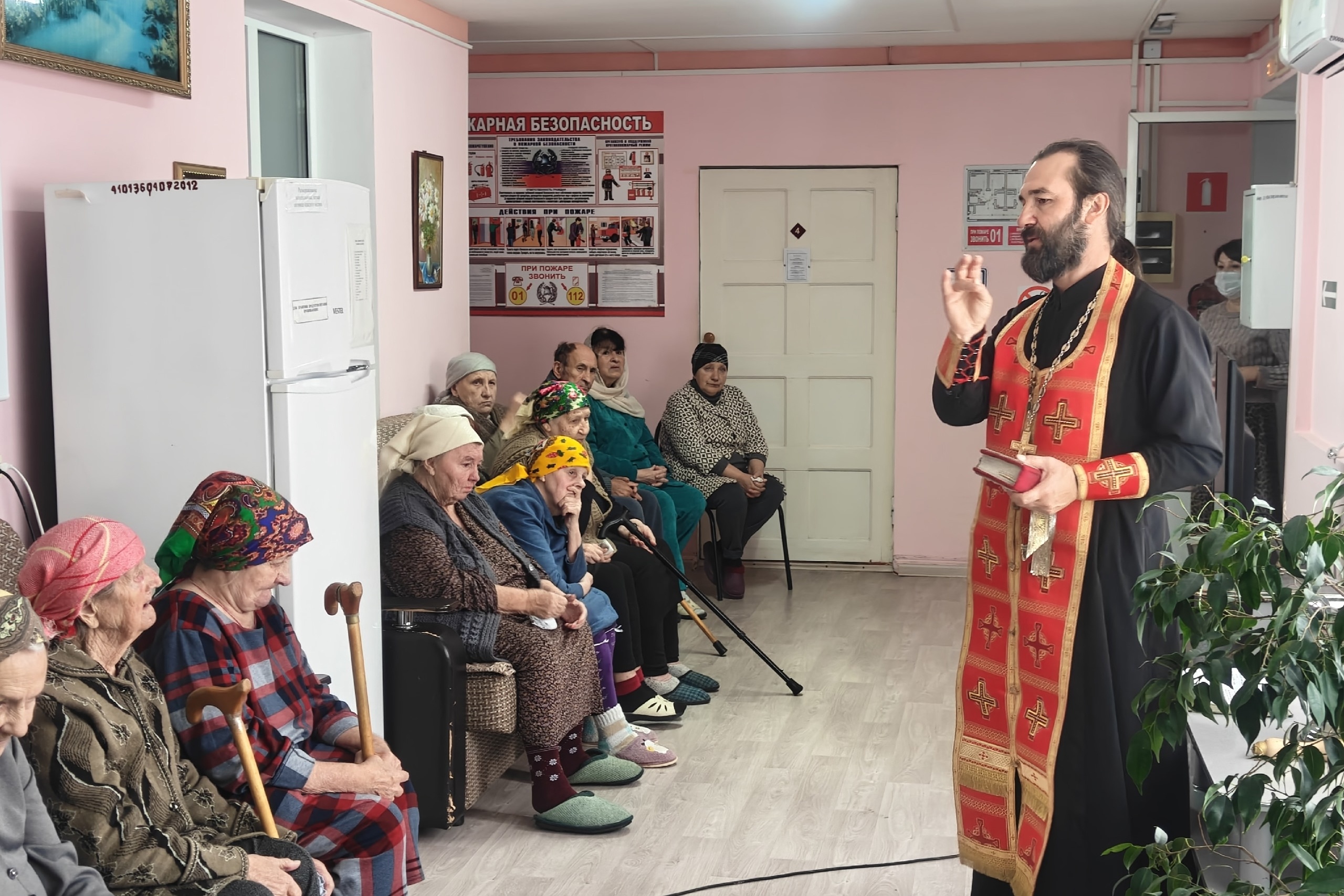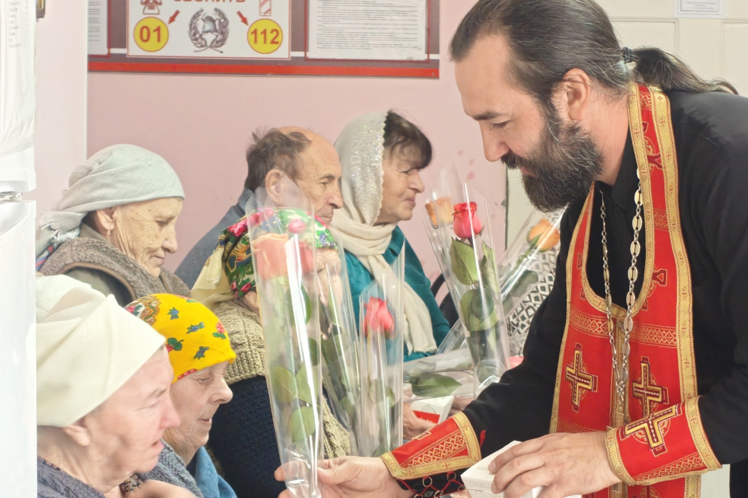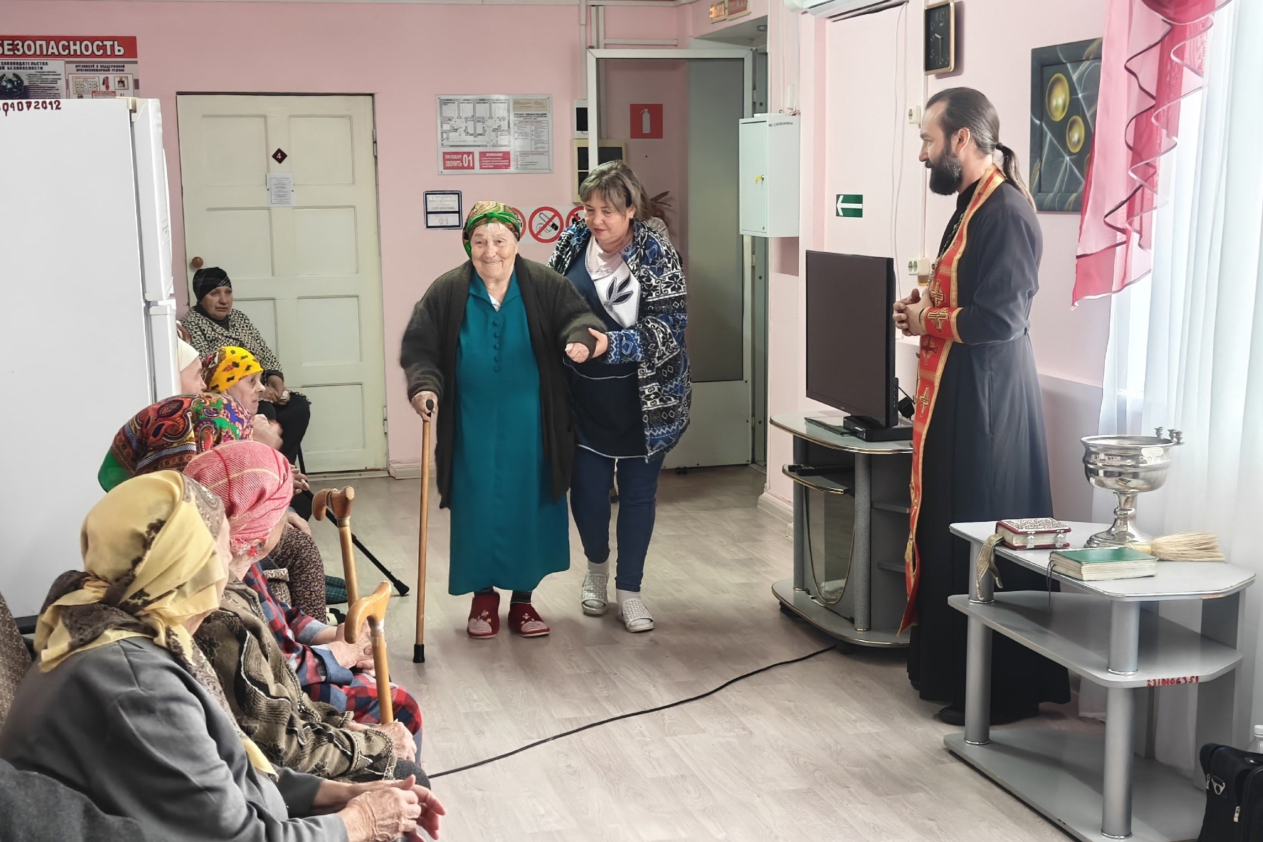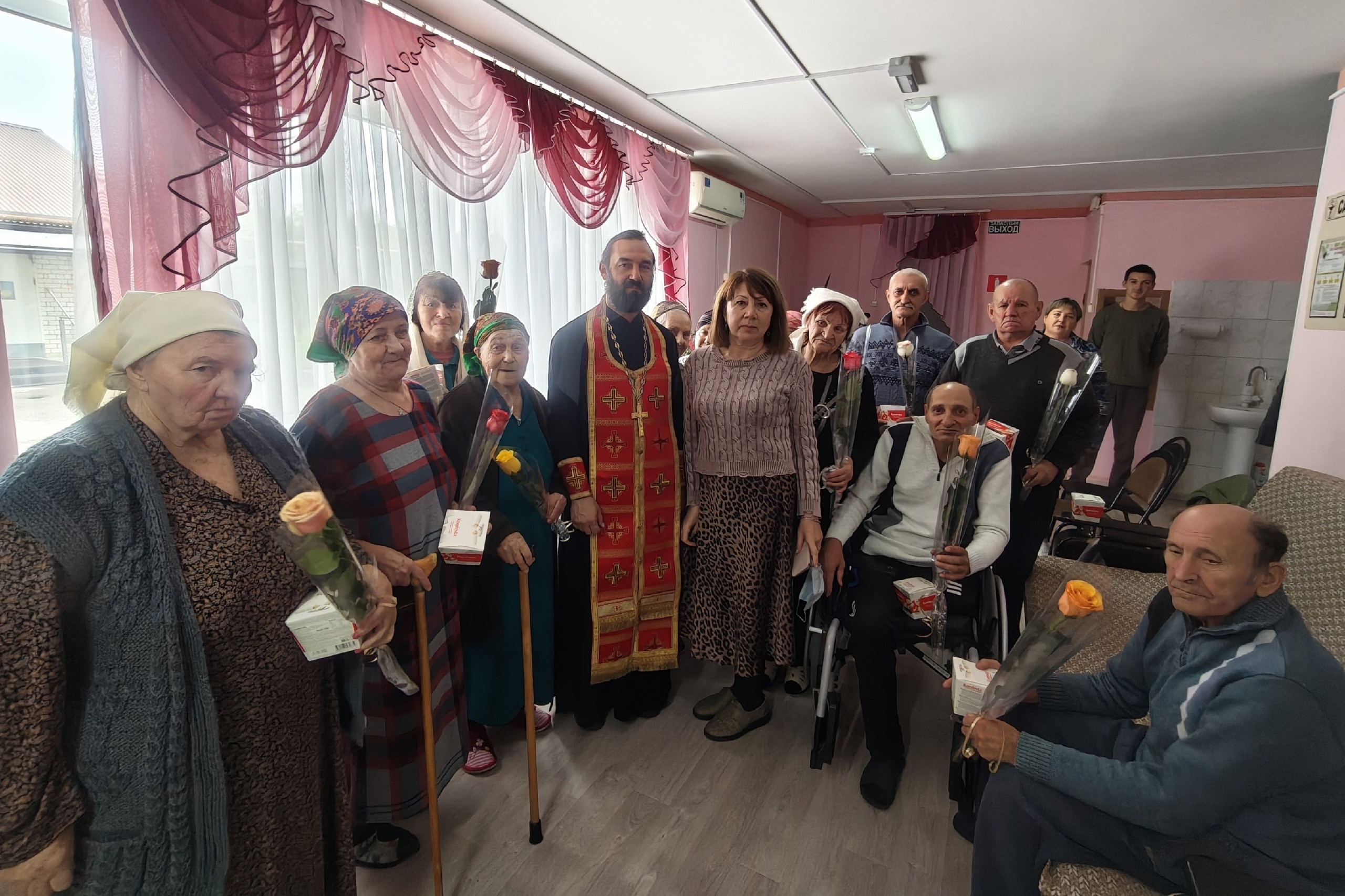 1 октября в стационарном отделении временного (постоянного) пребывания граждан ГБУ СО "Советский КЦСОН" в городе Зеленокумске состоялось чествование, находящихся в нём, пожилых людей. Сотрудники и подопечные отделения встретились с благочинным Зеленокумского округа, руководителем Миссионерского отдела Георгиевской епархии протоиереем Романом Квитченко. Священник поздравил собравшихся с Международным Днём пожилых людей, отметил, что жизненный опыт и житейская мудрость, которой они делятся с молодыми поколениями неоценимы. Пожелал им крепости духа и телесного здоровья. После окончания молебна отец Роман всех благословил, окропил святой водой и передал поздравления и цветы от епископа Георгиевского и Прасковейского Николая, а так же конфеты и фрукты. А ящик груш из собственного сада стал гостинцем от отца Романа и его семьи. После памятного фото, собравшиеся поблагодарили батюшку за внимание и просили прийти к ним вновь. Далее праздник продолжился вокальными номерами под гармонь, подготовленными сотрудниками отдела культуры администрации Советского муниципального округа Ставропольского края. Встреча прошла в теплой семейной атмосфере и стала настоящим праздником для одиноких людей.