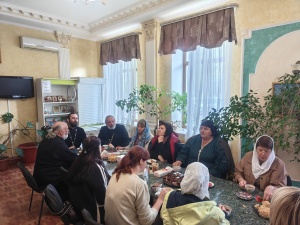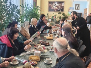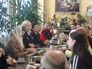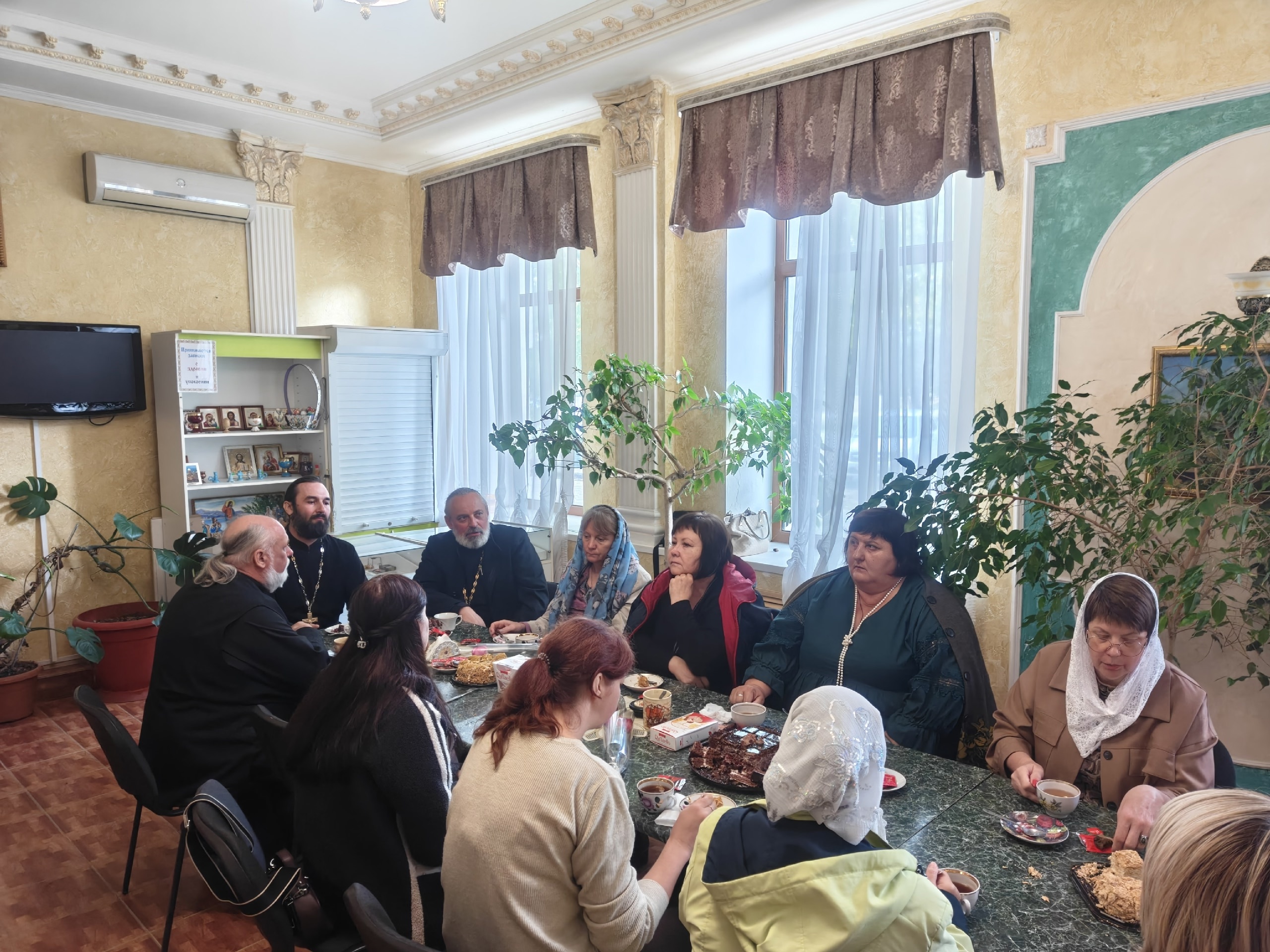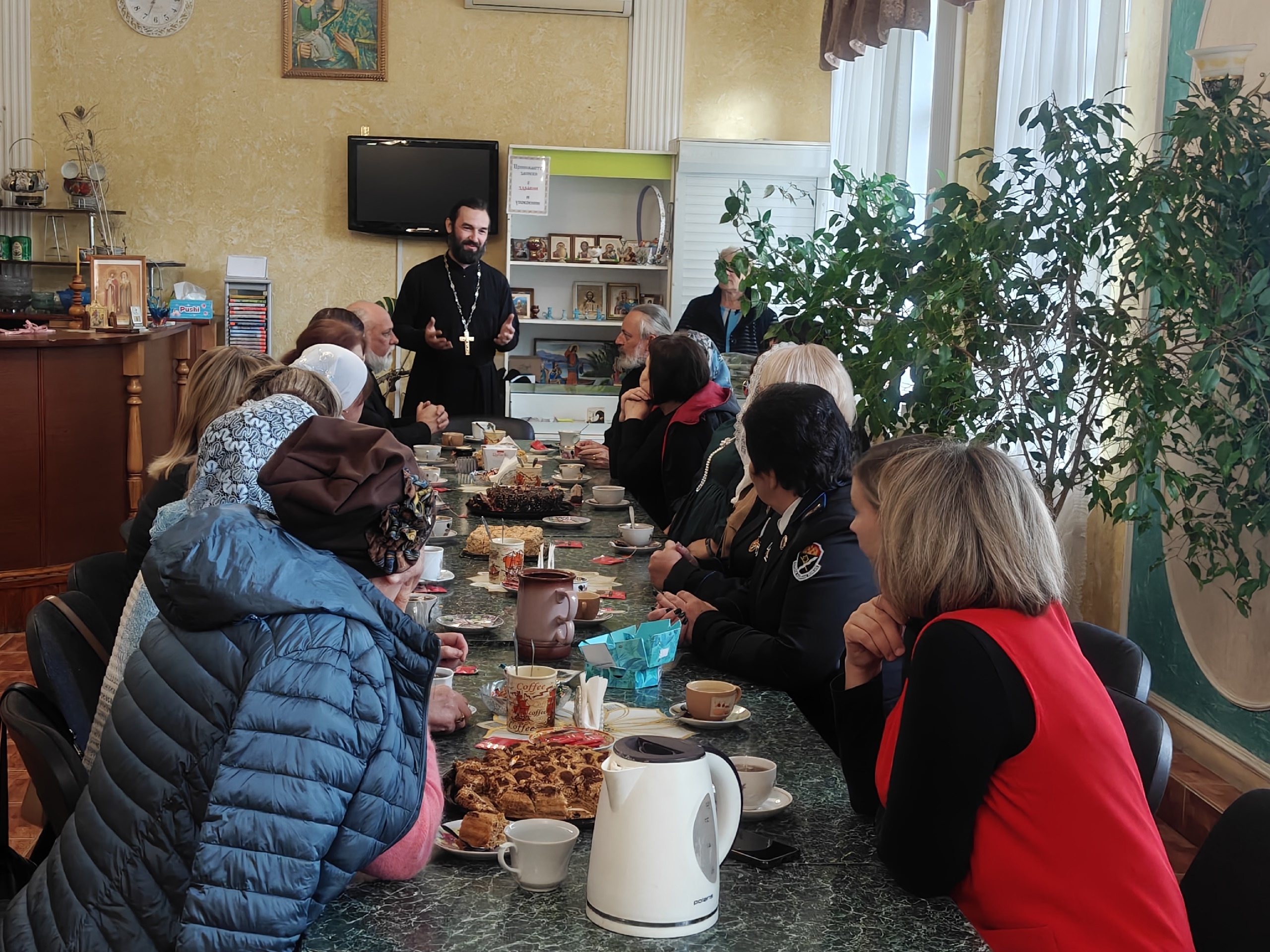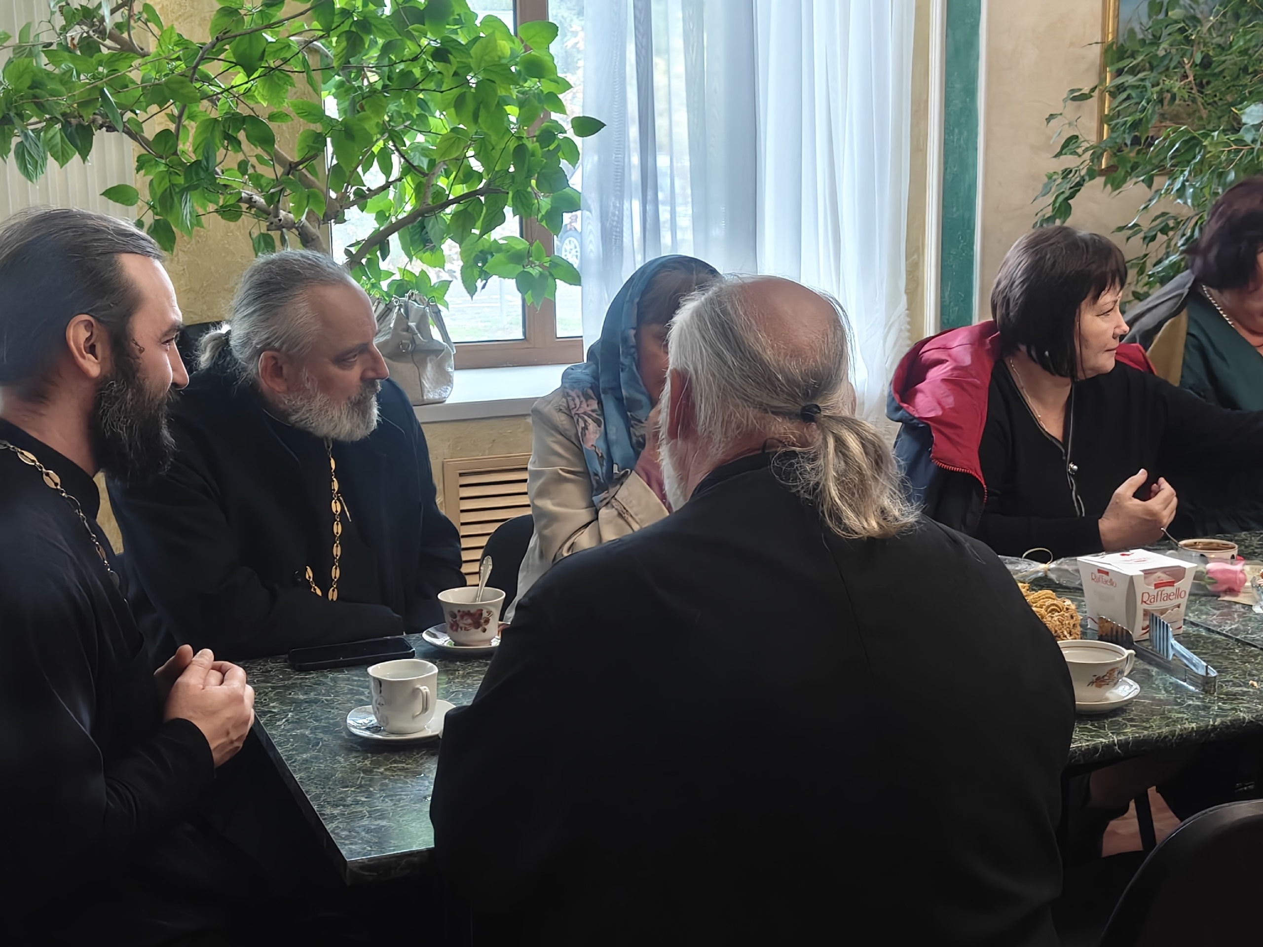 После поздравительных и напутственные слов все угостились чаем с тортами, завязался важный разговор. Делились мыслями и опытом работы православных учителей в светских школах. Обсуждали где та грань допустимого преподавания Православной культуры, а где созданы условия для призывания детей и их родителей к молитве, жизни по заповедям, участию в приходской жизни и церковных таинствах.